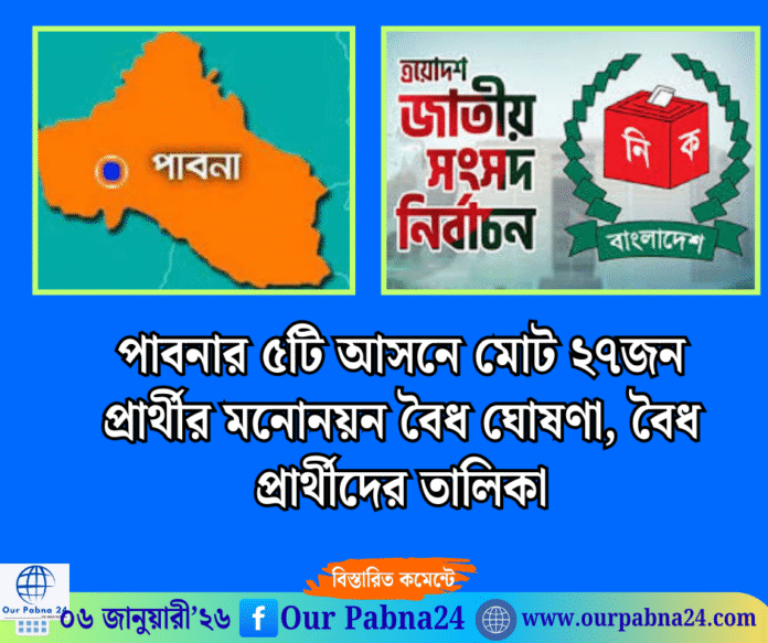 অনলাইন ডেস্ক : আসন্ন ত্রয়োদশ জাতীয় সংসদ নির্বাচনে পাবনা ৫টি আসনে মনোনয়ন যাচাই-বাচাই শেষে জেলা রিটার্নিং অফিসার মোট ২৭ জন প্রার্থীর মনোনয়ন বৈধ ঘোষণা করেছে। বৈধ প্রার্থীদের তালিকা :-