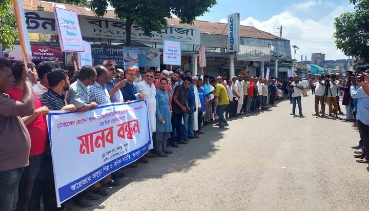 ভাঙ্গুড়া শিল্প ও বনিক সমিতির সহ সভাপতি মোঃ সাইফুল ইসলাম এর নেতৃত্বে মানববন্ধনে বক্তারা বলেন, গত ৫ আগস্টের তারিখের পর ভাঙ্গুড়ায় ব্যবসায়ী সমাজকে ভয়ভীতি দেখিয়ে চাঁদা আদায়ের ঘৃণ্য ঘটনা আমরা কোনোভাবেই মেনে নেব না। গত ৪ সেপ্টেম্বর রাত ৯টার দিকে ভাঙ্গুড়া বাজারের বকুলতলায় অবস্থিত বিশিষ্ট ব্যবসায়ী এ.কে.এম. হানিফ (বাবলু)র নিজস্ব অফিসে পাবনা মোটর শ্রমিক ইউনিয়নের ভাঙ্গুড়া উপজেলা শাখার সভাপতি মোতালেব হোসেন গং প্রকাশ্যে প্রবেশ করে ভয়ভীতি প্রদর্শন করে। তিনি বাবলু সাহেবের নিকট পঞ্চাশ হাজার টাকা চাঁদা দাবি করেন এবং টাকা না দিলে জীবন নাশের হুমকি প্রদান করেন।